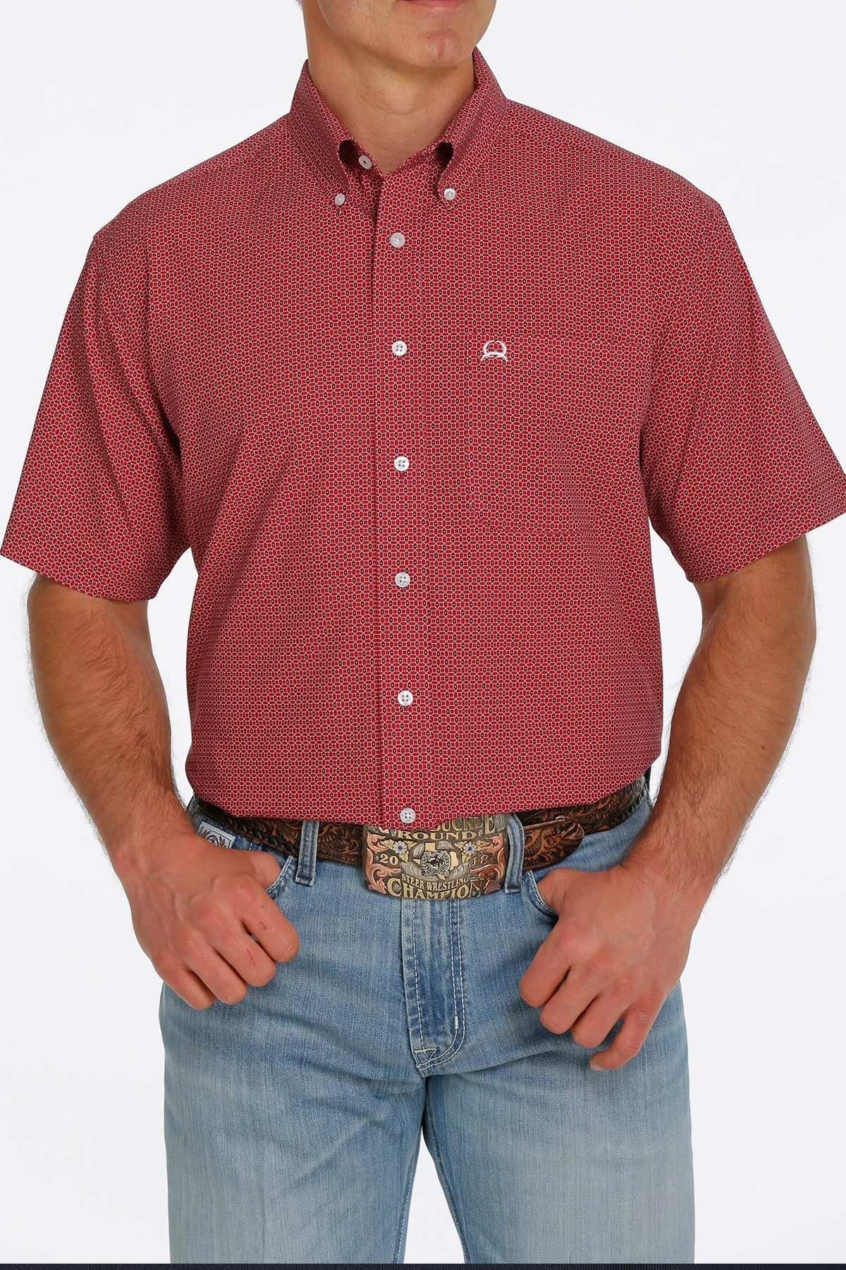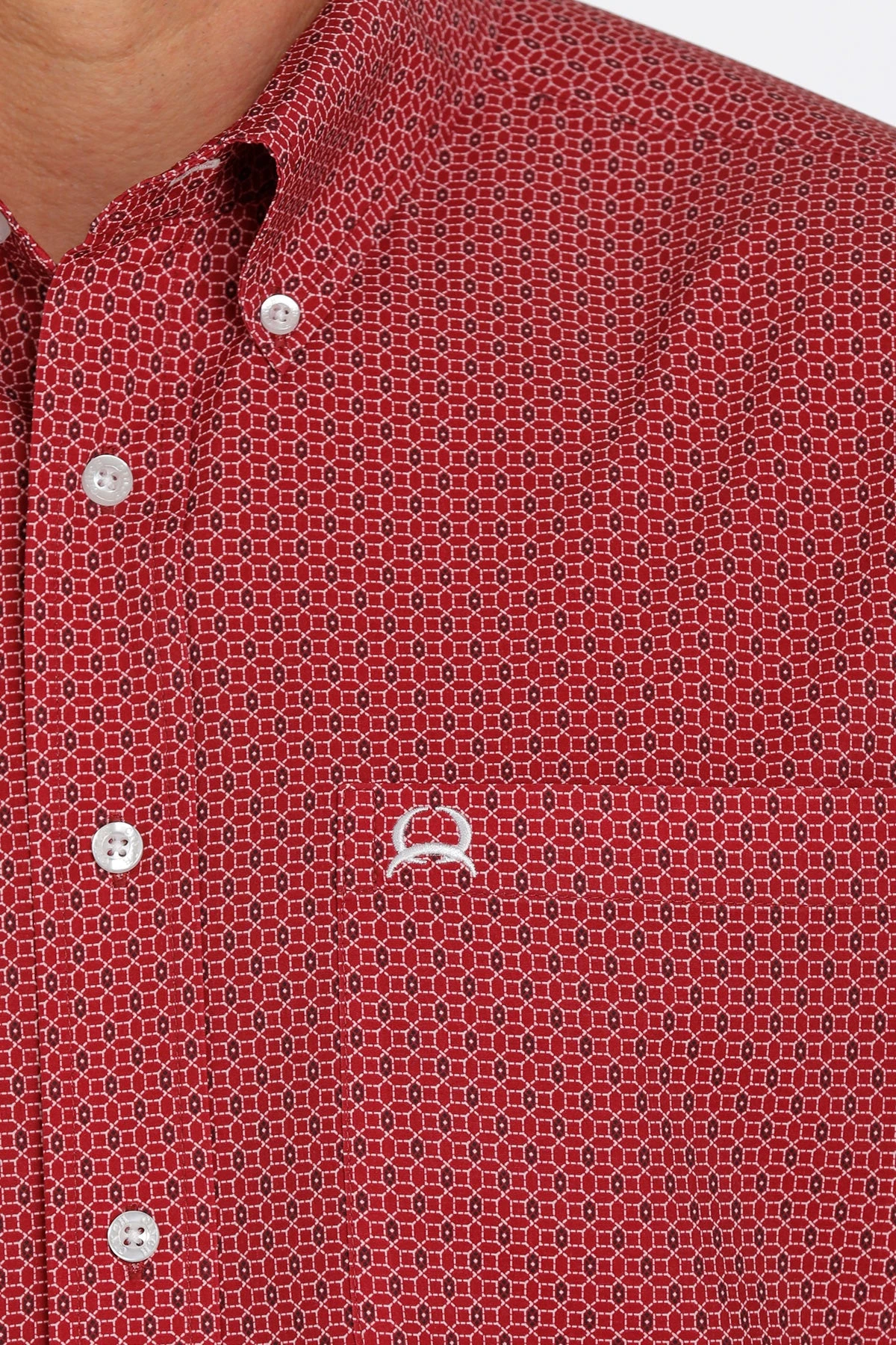 Red Geometric Print Short Sleeve Arenaflex Button Down Shirt.