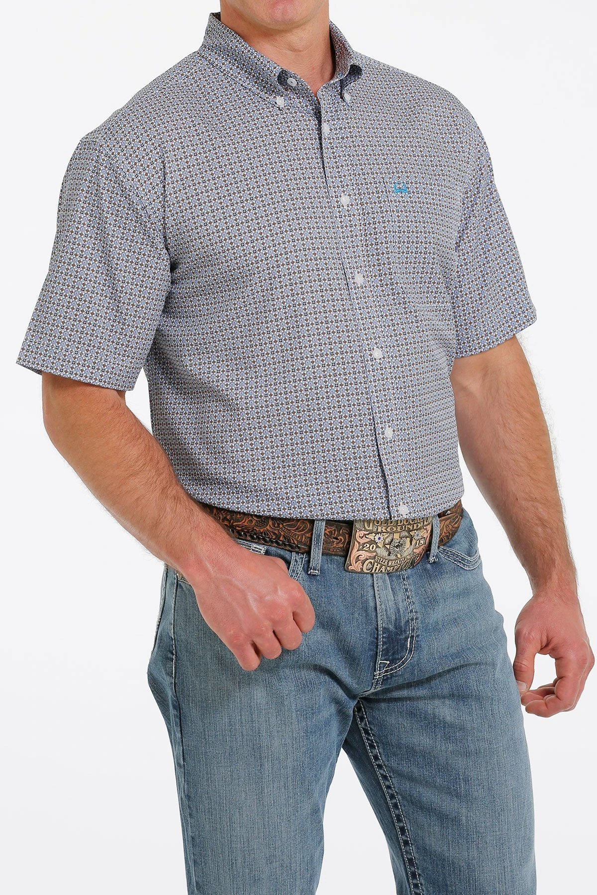White and Blue Geometric Print Short Sleeve ArenaFlex Button Down Shirt.