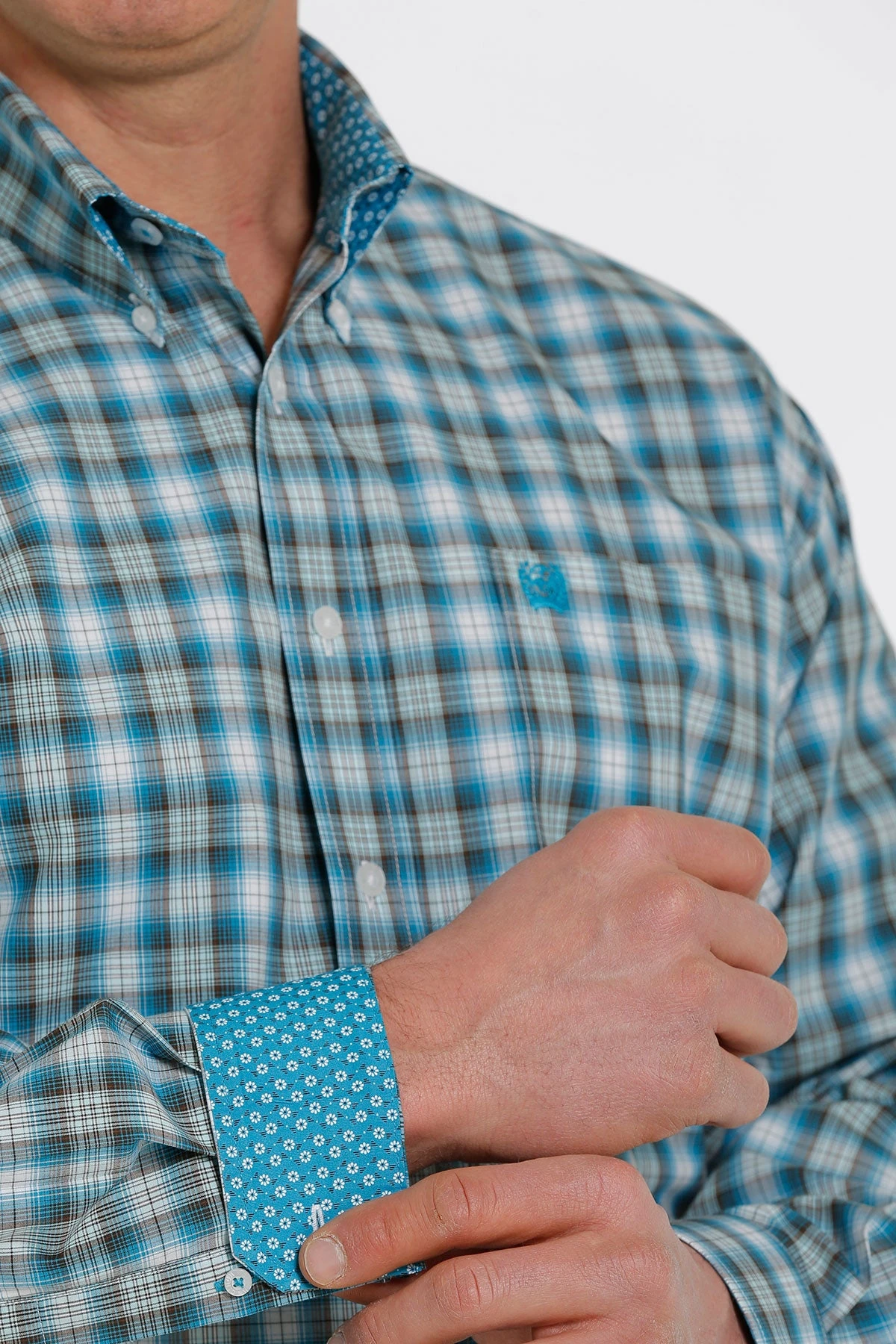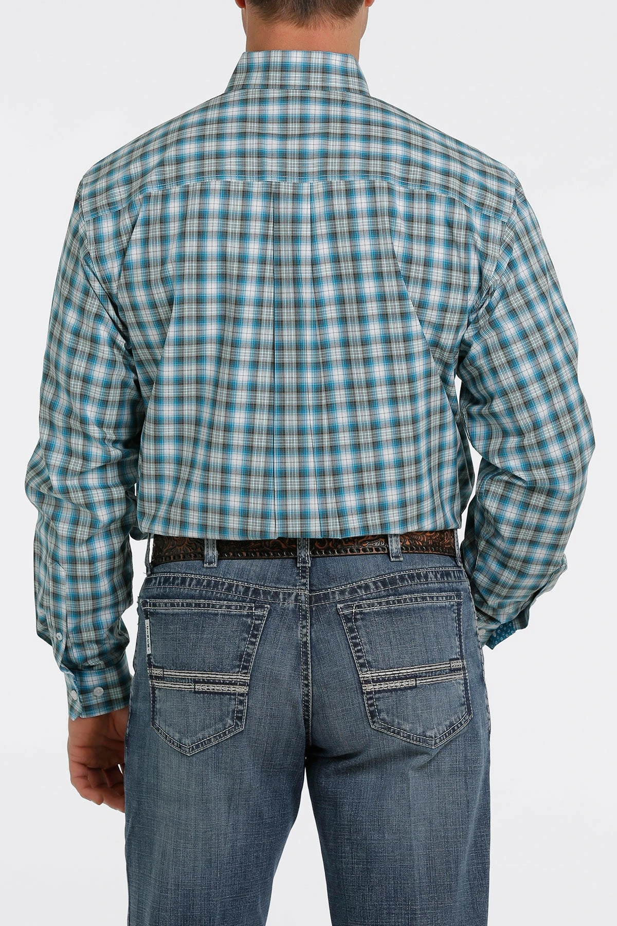 Turquoise and White Plaid Long Sleeve Button Down Shirt.