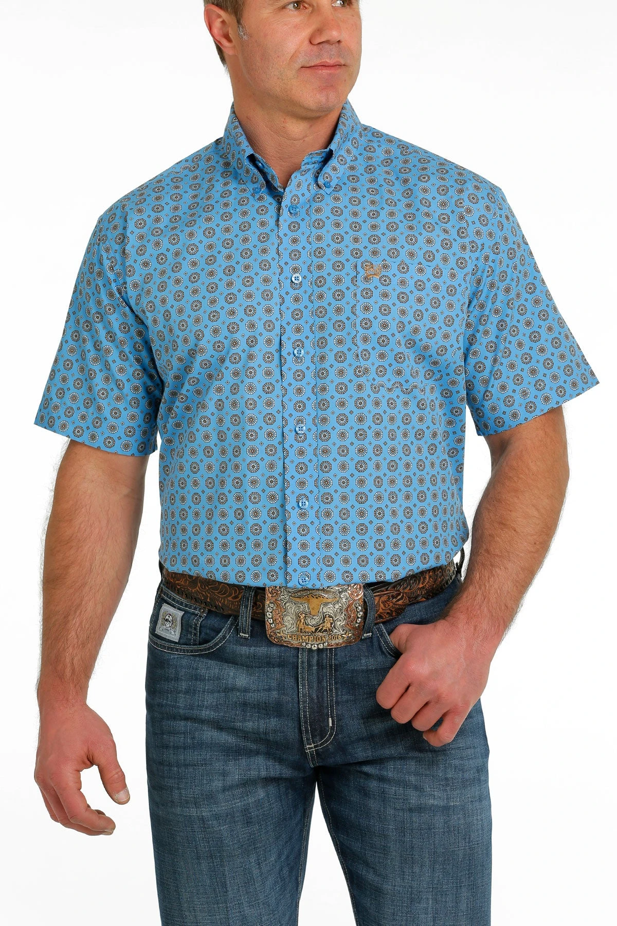 Blue, Gray and White Medallion Print Short Sleeve Button Down Shirt.