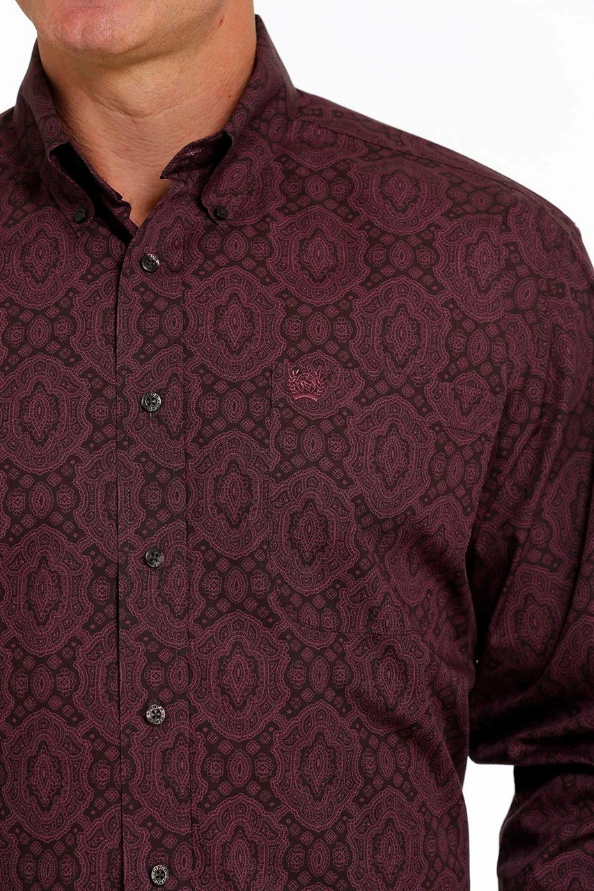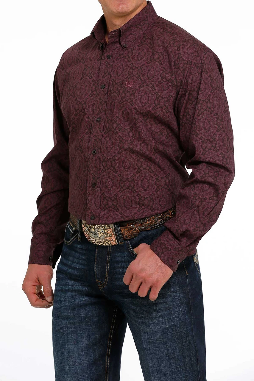 Brown and Purple Paisley Print Long Sleeve Button Down Shirt.