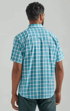 Turquoise and White Serape Print Short Sleeve Snap Front Shirt.