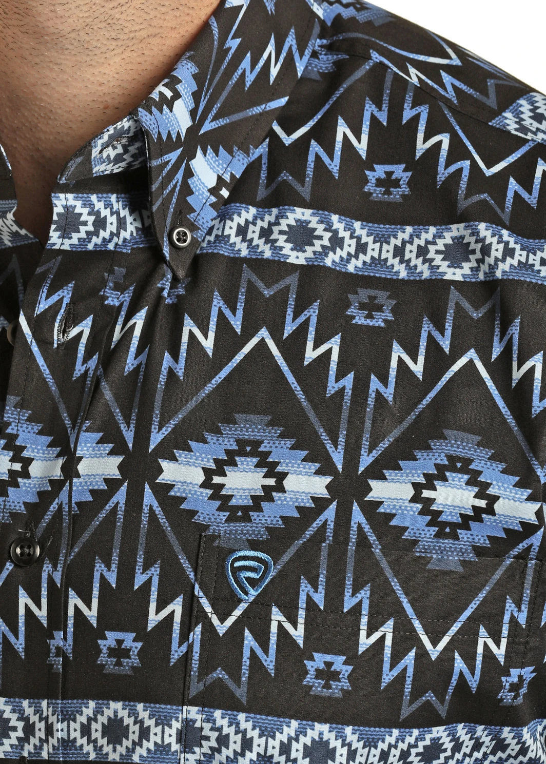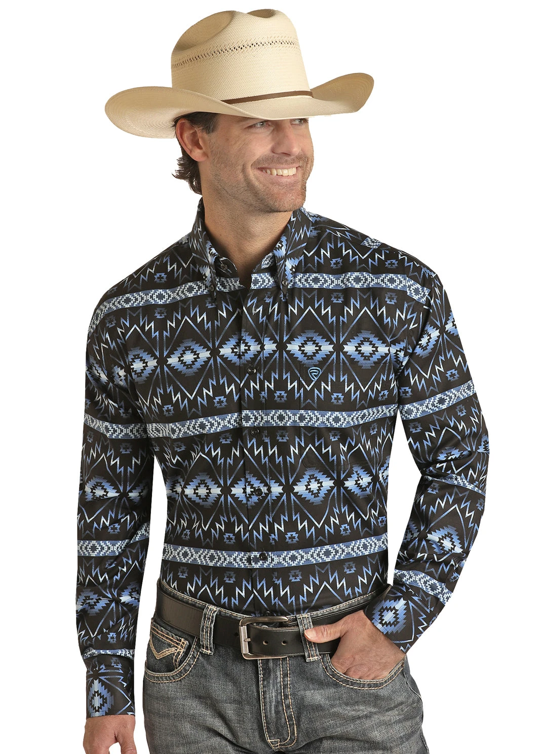 Blue and Black Aztec Print Long Sleeve Button Down Shirt.