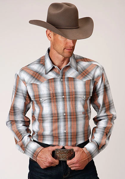 Grey and Dusk Ombre Plaid Long Sleeve Snap Front Shirt.