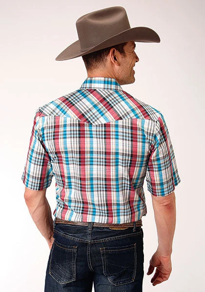 Cream, Turquoise, Red and Black Plaid Short Sleeve Snap Front Shirt.