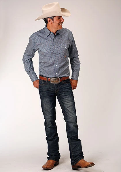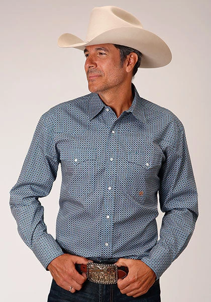Blue Geometric Print Long Sleeve Snap Front Shirt.