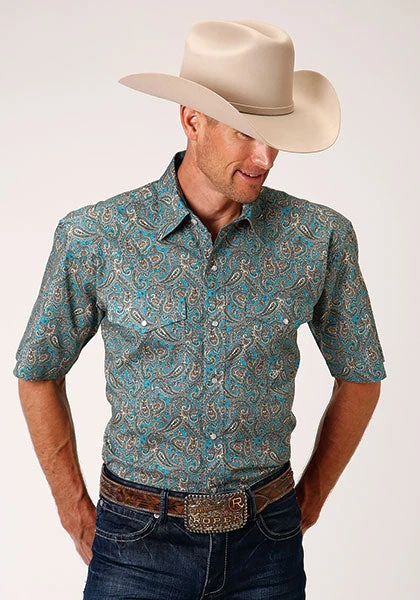 Turquoise and Tan Saddle Paisley Short Sleeve Snap Front Shirt.