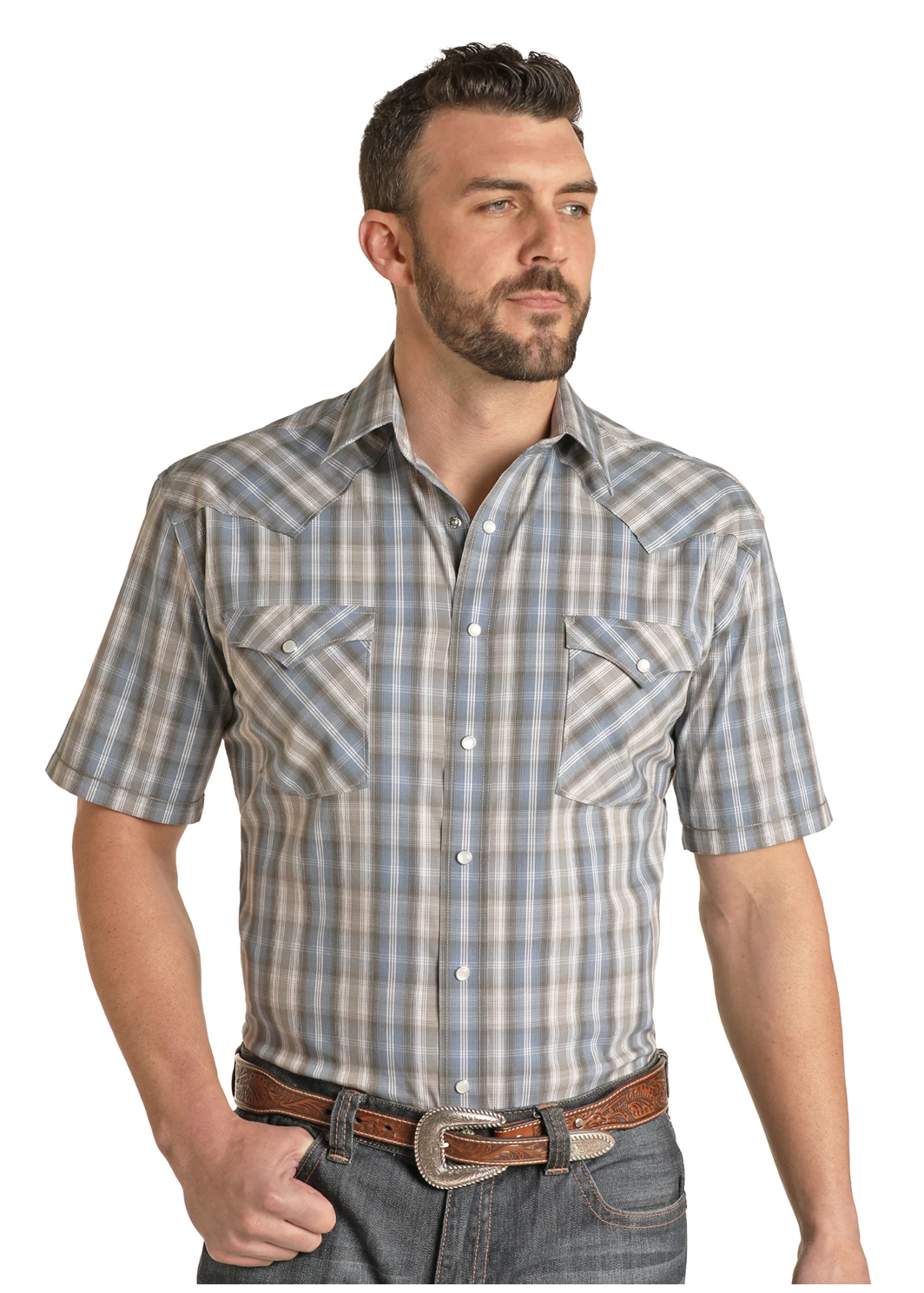 Blue and Tan Plaid Short Sleeve Snap Front Shirt.