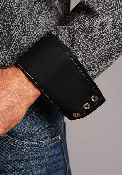 Grey Aztec Print Long Sleeve Snap Front Shirt.