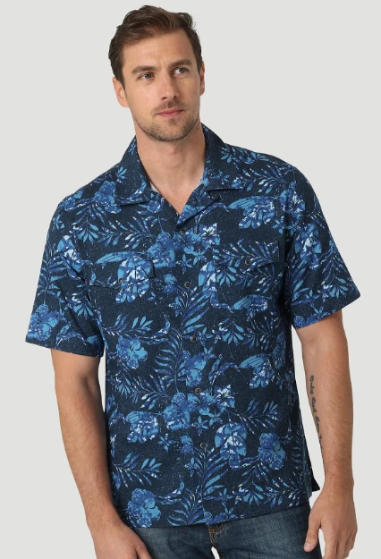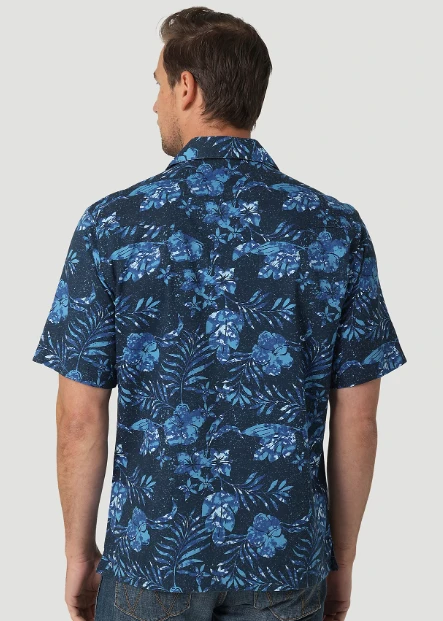 Lush Blue Tropical Print Coconut Cowboy Short Sleeve Snap Front Shirt.