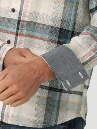Off White and Multi-Color Plaid Long Sleeve Button Down Shirt.