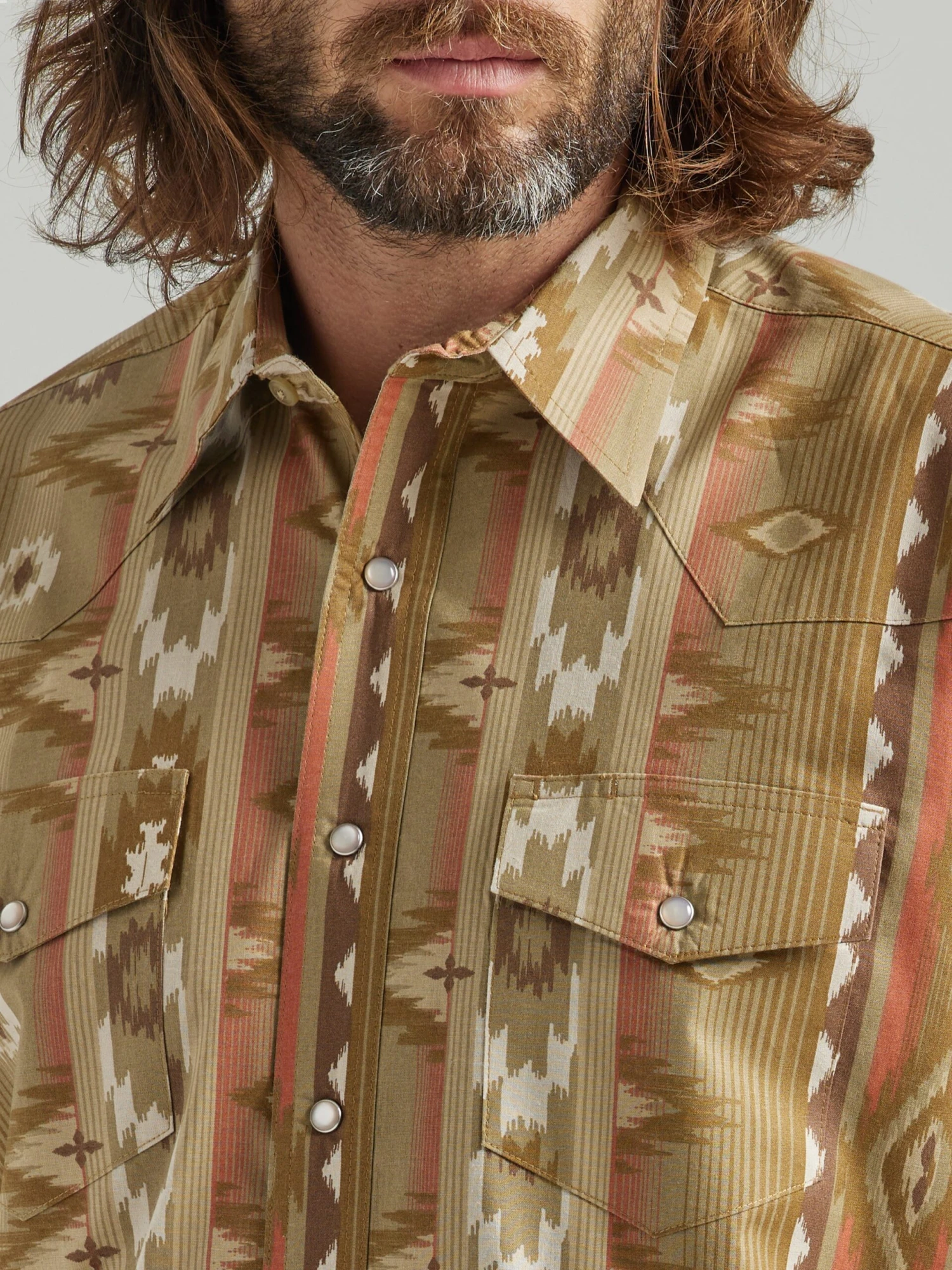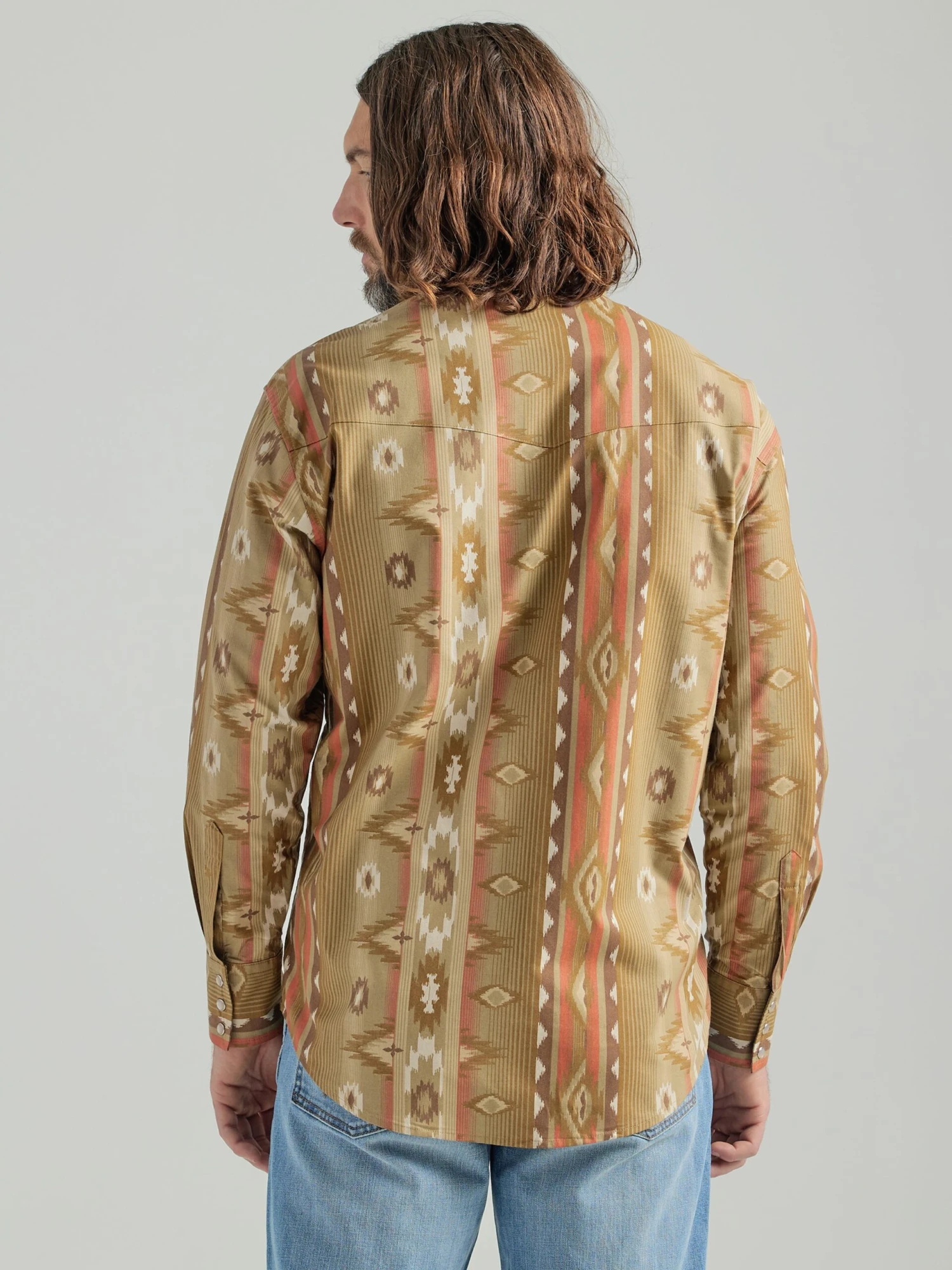 Cinnamon Tan Aztec Print Long Sleeve Snap Front Shirt.